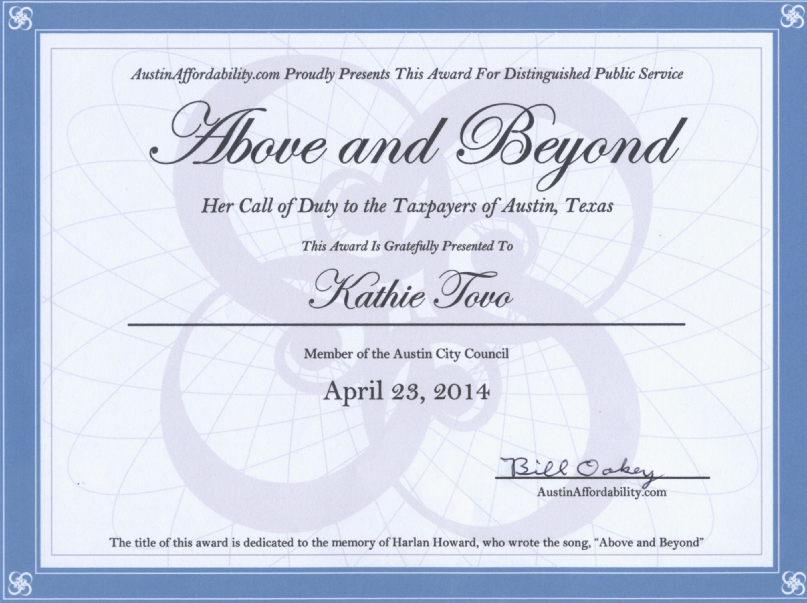 Giving an award is one of the fun parts of an otherwise treacherous process. Along with it comes the AustinAffordability.com endorsement for Kathie for District 9 in the upcoming City Council election. You can see the award below. Click to enlarge it.