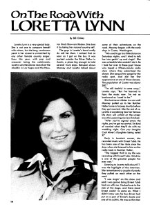 On a crazy whim, I picked up the phone and called Directory Assistance. They put me through to     the sisters’ home, and we chatted for a good while. They invited me to come to Nashville for the annual Fan Fair event. I just needed to buy a $35 ticket, fly out there, and the sisters would introduce me to Loretta Lynn. It was all kinds of fun! After I got back home, arrangements were made for me to interview Loretta for a cover story in Country Song Roundup magazine. (Click to enlarge photos).